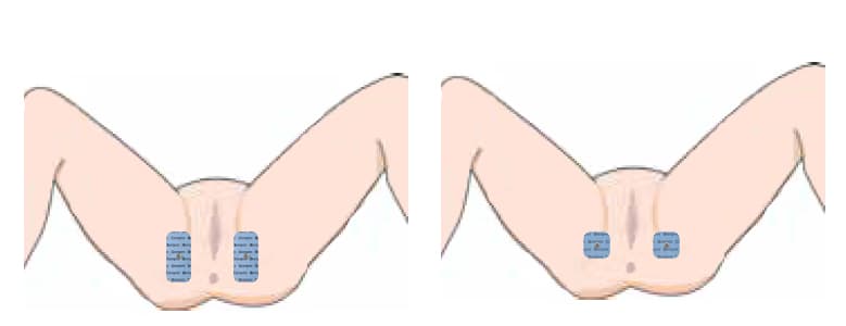 Du kannst dafür sowohl große (z. B. 50x90 mm) als auch kleinere (z. B. 50x50 mm) selbstklebende Elektroden verwenden. Bringe die Elektroden beidseitig in den Leistenfalten an. Positioniere sie so, dass sich die Vaginalöffnung oder die Afteröffnung zwischen ihnen befindet. Zwischen den beiden Elektroden sollte ein handflächengroßer Abstand sein. Nach Start des auf die Inkontinenzform abgestimmten Programms erhöhe den Impuls so weit, bis deutliche Kontraktionen der Beckenbodenmuskulatur entstehen.