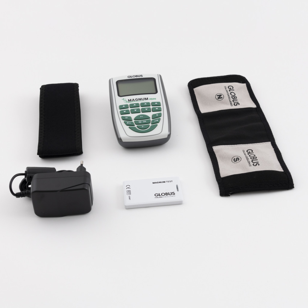 Der Preis beinhaltet: Magnum 2500 Gerät, 1 flexibler Magnetspule (30x10cm), 1 Klettband, Netzadapter, Tragetasche, 1 Gerät zum Testen des magnetischen Feldes