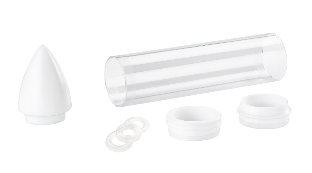 1 Adapter (weiß) für den Pumpenkopf, 1 großer Zylinder, 1 Adapter (weiß) für den Konus, 1 Konus zur Befestigung der Verengungsringe, 1 Verengungsring (22 mm), 1 Tube Gleitgel